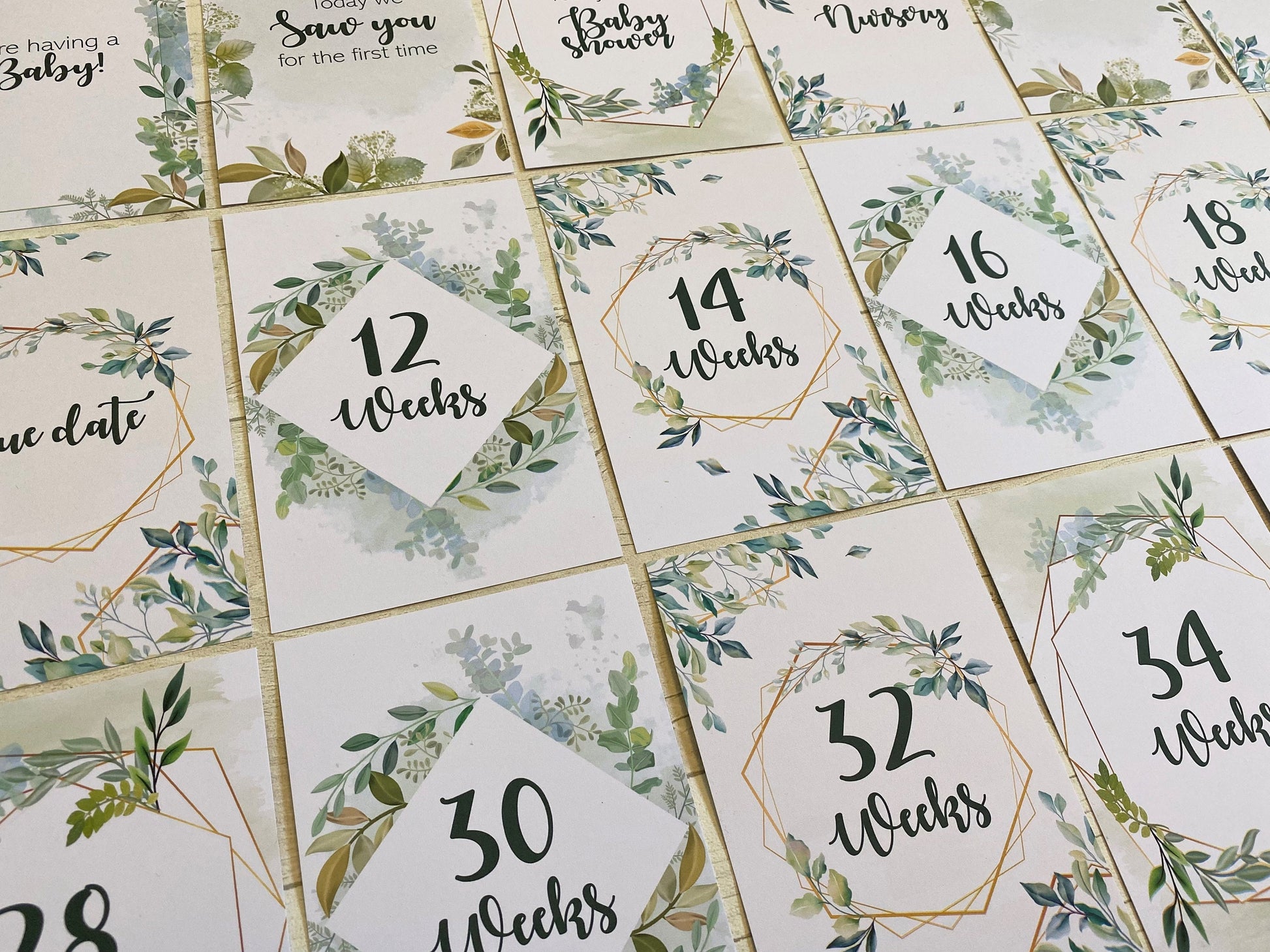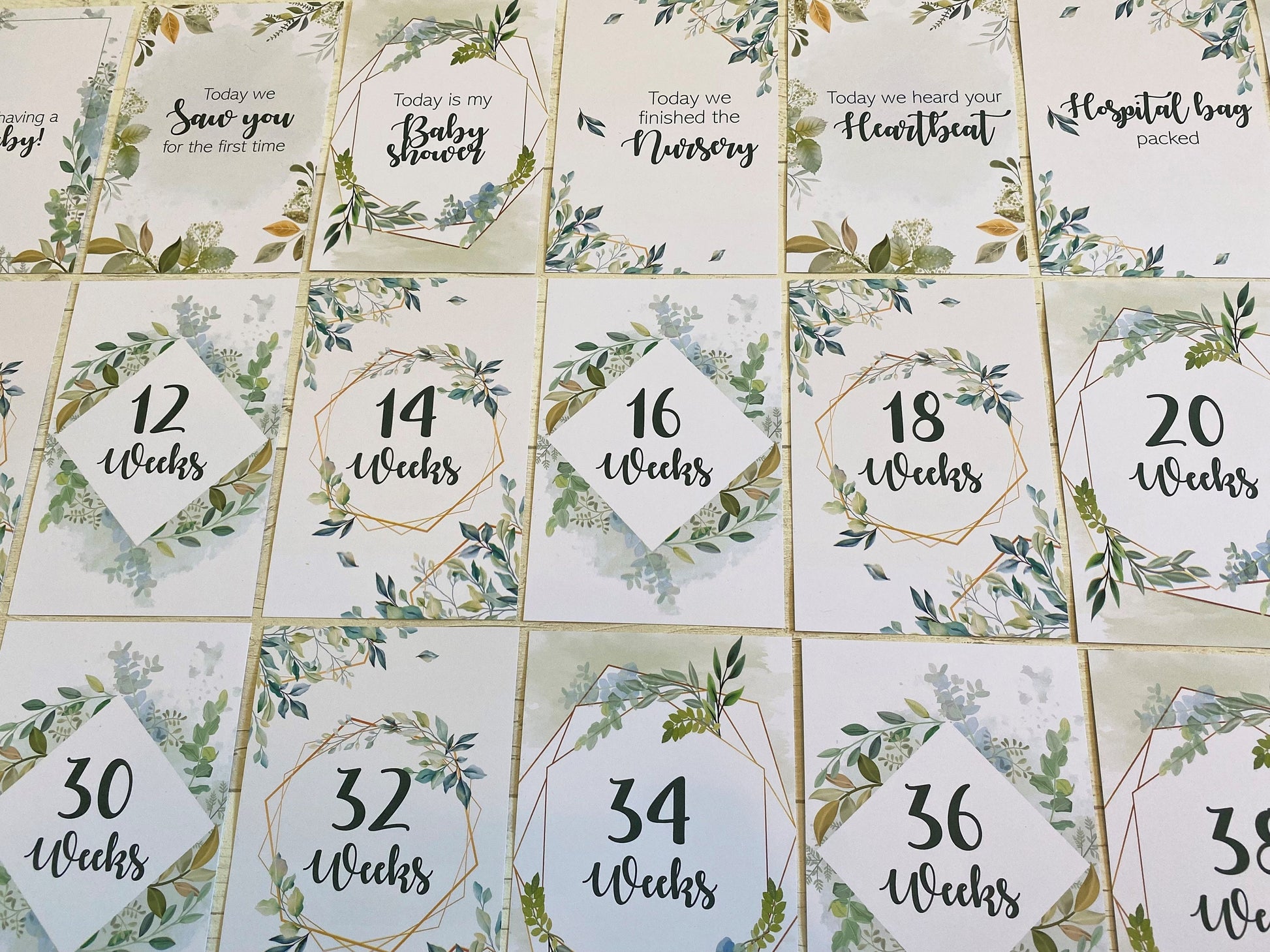 WE'RE HAVING A BABY, TODAY WE SAW YOU FOR THE FIRST TIME, TODAY IS MY BABY SHOWER, TODAY WE FINISHED THE NURSERY, TODAY WE HEARD YOUR HEARTBEAT, BABY SCAN, HOSPITAL BAG PACKED, I CANT STOP BUYING BABY THINGS. TODAY I FELT YOU MOVE, DUE DATE 12 WEEKS - 40 WEEKS (milestone card for every 2 weeks) - please note the 34 week milestone card is missing from the main photo, due to not being able to fit all the cards onto the image, but this will be included in the pack.
